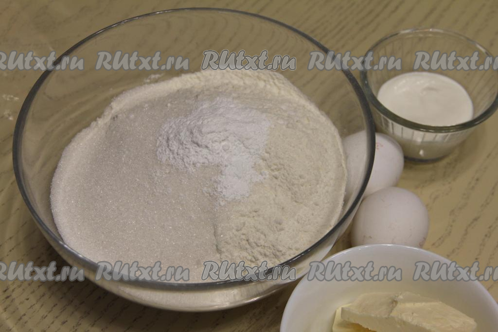 Прежде всего замесим песочное тесто, для этого в миску нужно всыпать просеянную муку, сахар и разрыхлитель.