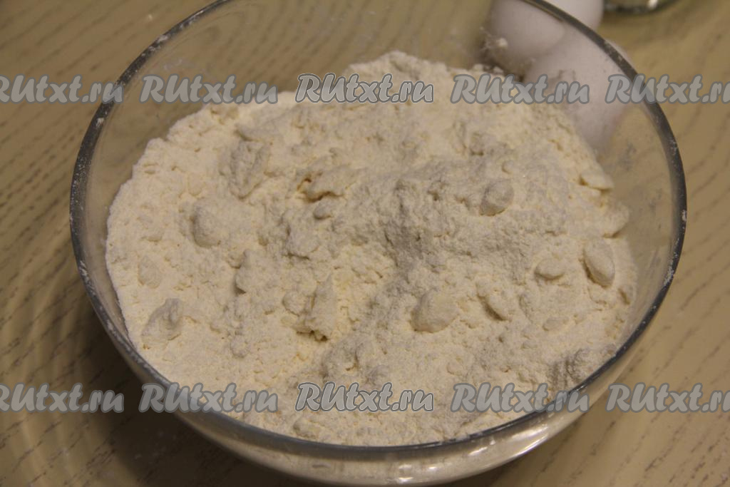 Перемешать сухие ингредиенты в миске, затем добавить холодное (из холодильника) сливочное масло, нарезанное на кусочки.
