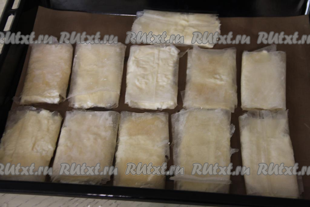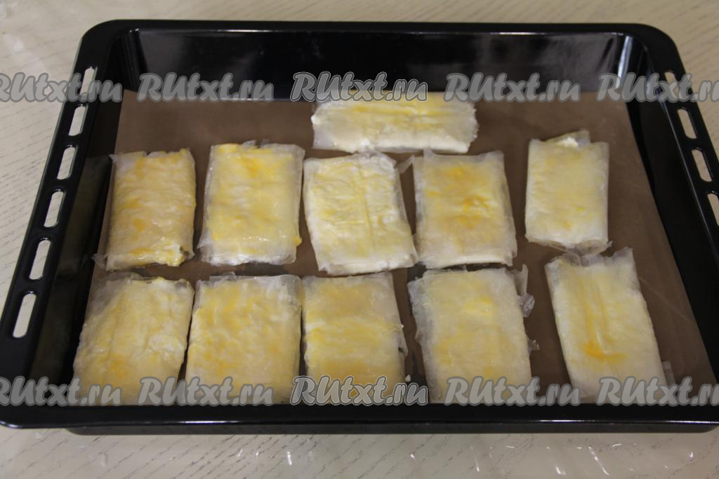 Выпекать пирожки с творогом в разогретой до 200 градусов духовке минут 20 (до золотистого цвета теста фило).