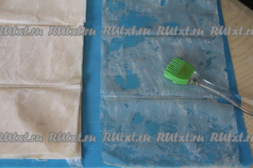 Вместо растительного масла можно использовать растопленное сливочное масло. Тесто фило очень любит масло, поэтому и смазывать его нужно очень хорошо.