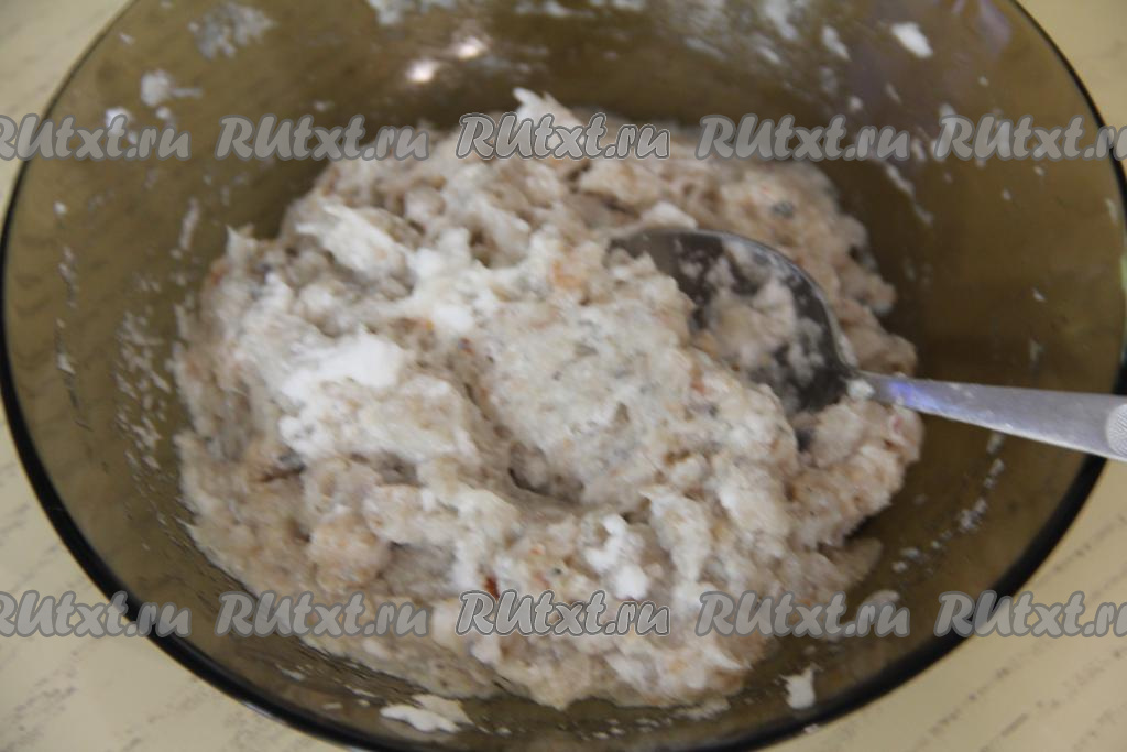 Рыбное филе и отжатый хлеб пропустить через мясорубку в объёмную миску.