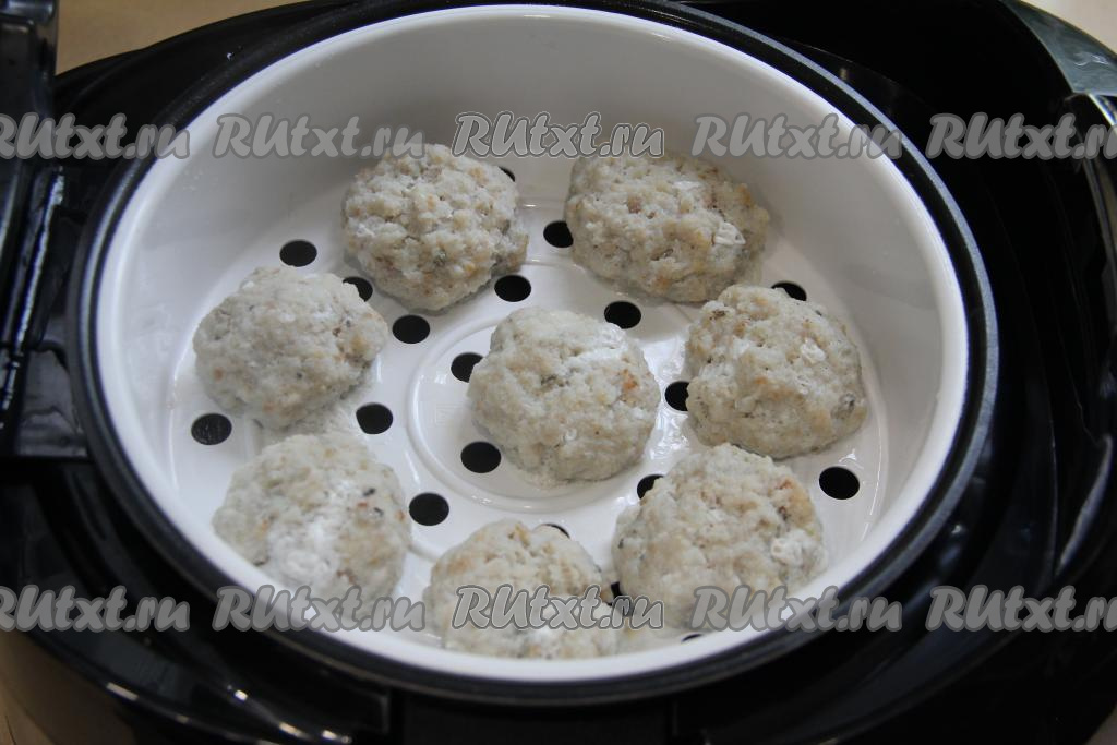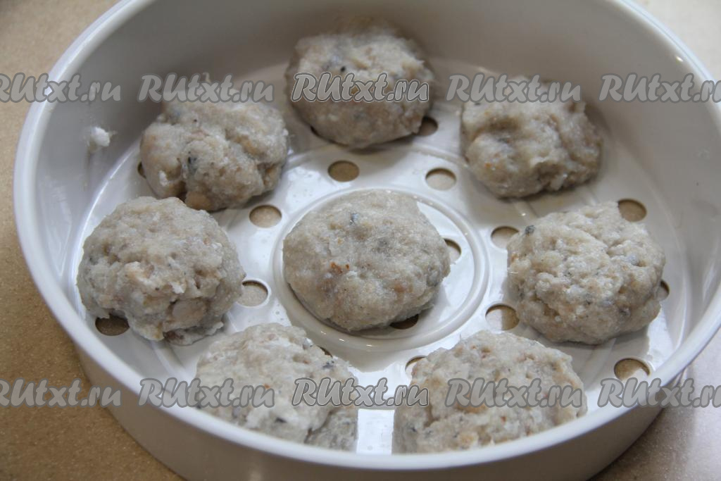 Из получившегося рыбного фарша сформировать небольшие шарики - кнели (я сформировала 8 штук), выложить их на поддон мультиварки для приготовления на пару (или на поддон пароварки).