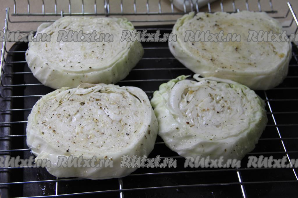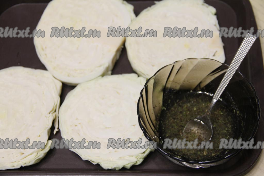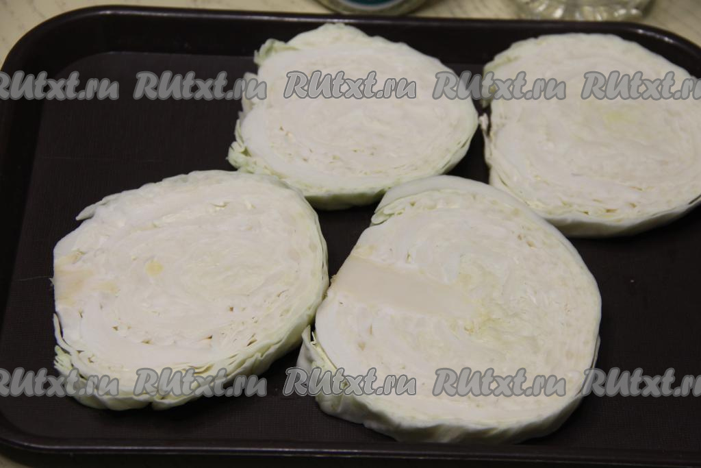 Капусту нарезать на стейки толщиной примерно 2,5 сантиметра (у меня получились 4 штуки).