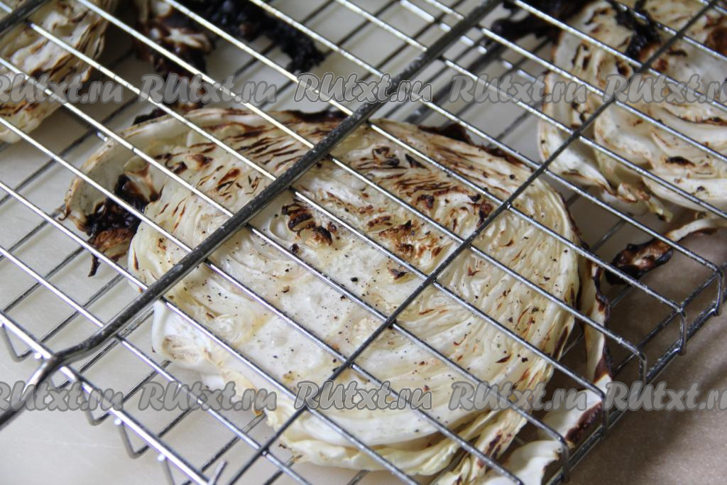 Подгоревшие крайние листочки можно убрать. Переложить вкусные, ароматные стейки из капусты на тарелку и подать к столу в качестве гарнира к мясу, дополнив соусом на ваш выбор.