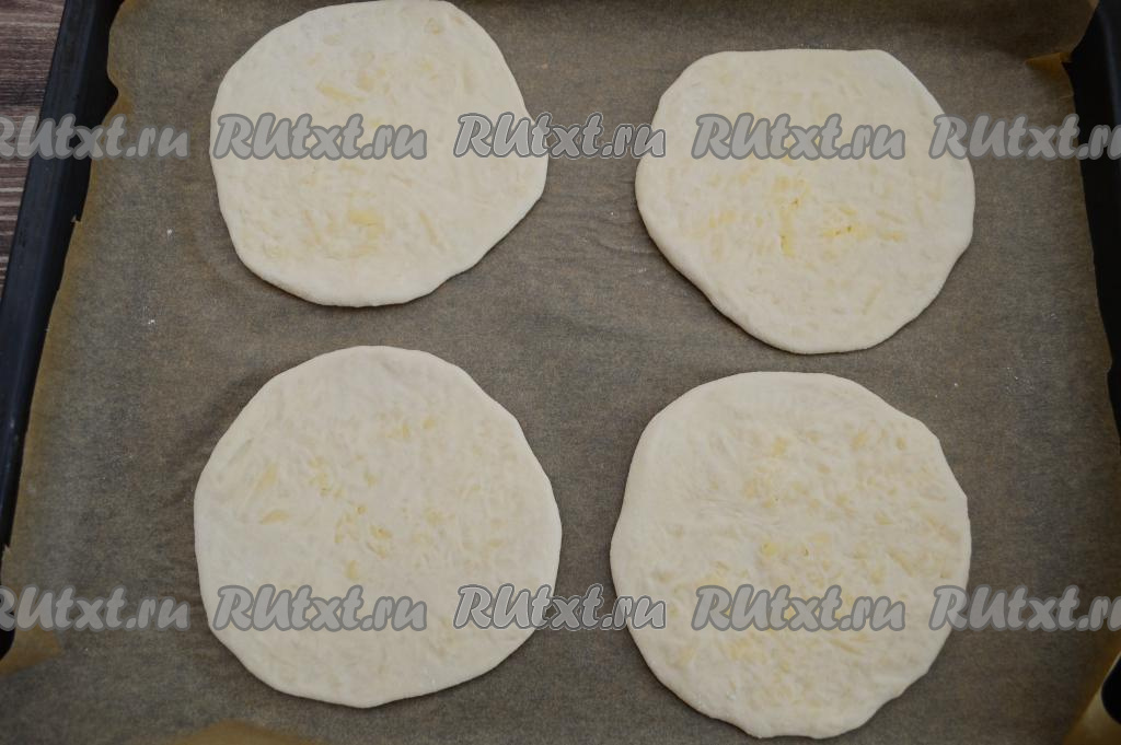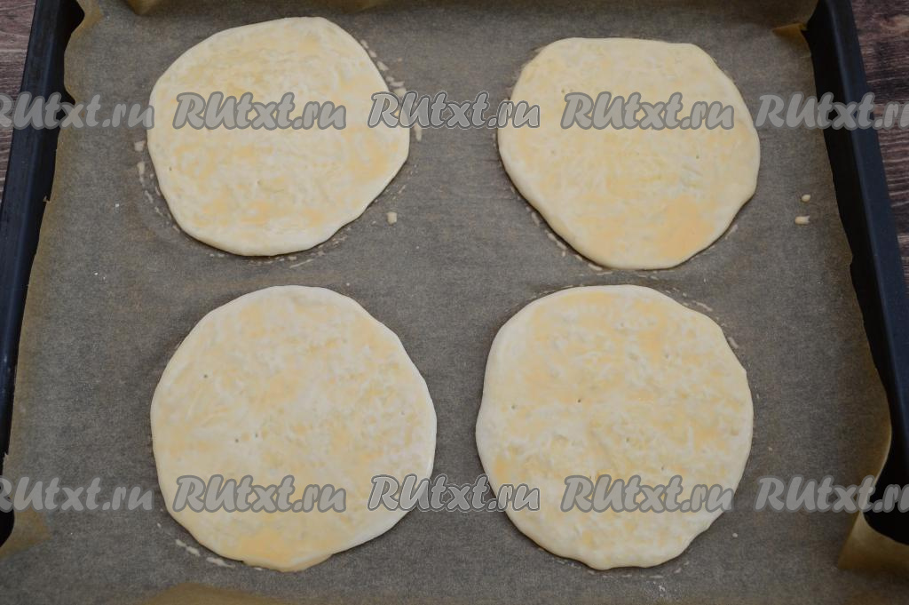 Сформированную лепёшку с сыром выложить на противень, застеленный пергаментом. Аналогично сформировать ещё 3 лепёшки из оставшегося сыра и оставшихся рулетиков из слоёного теста, выкладывая их на застеленный противень.