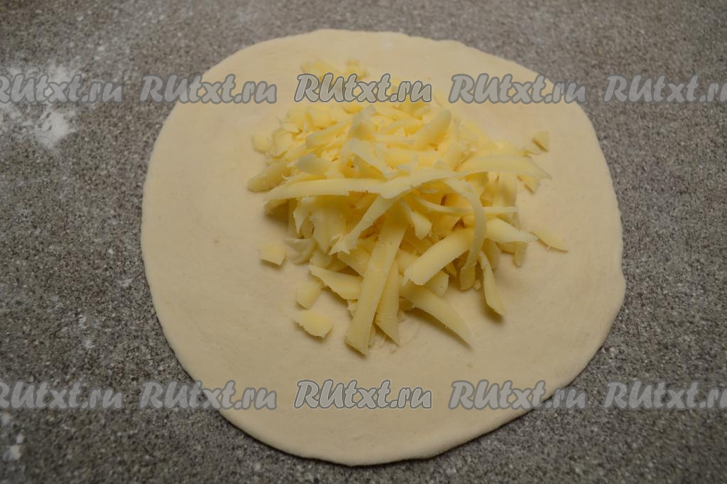 Сыр натереть на крупной тёрке, разделить его на 4 равных части (по количеству рулетиков из слоёного теста). Одну часть сыра выложить в центр раскатанного круга из теста.