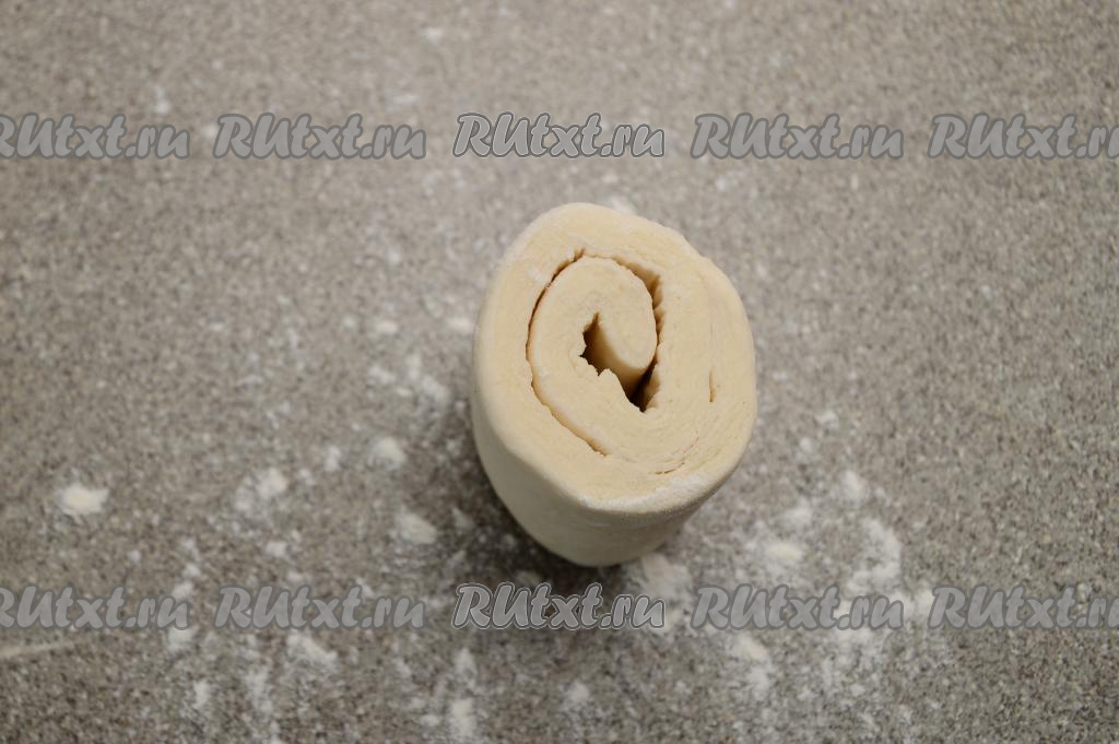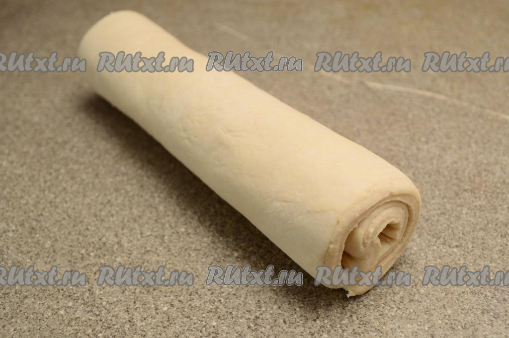 На слегка присыпанной мукой поверхности размороженный пласт слоёного теста, не раскатывая, свернуть в рулет.