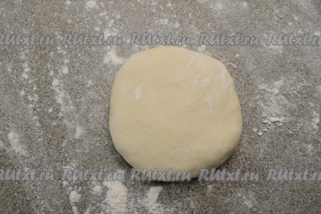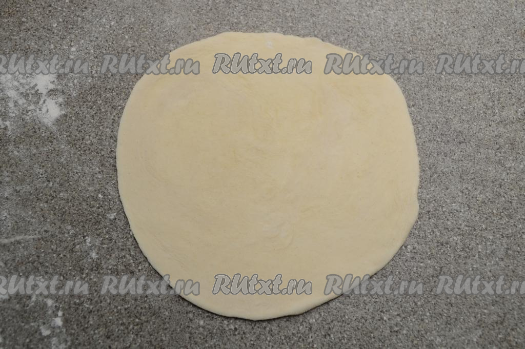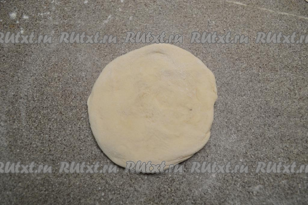 Скалкой раскатать получившуюся лепёшку в круг толщиной 3 миллиметра (у меня получился круг диаметром 15 сантиметров).