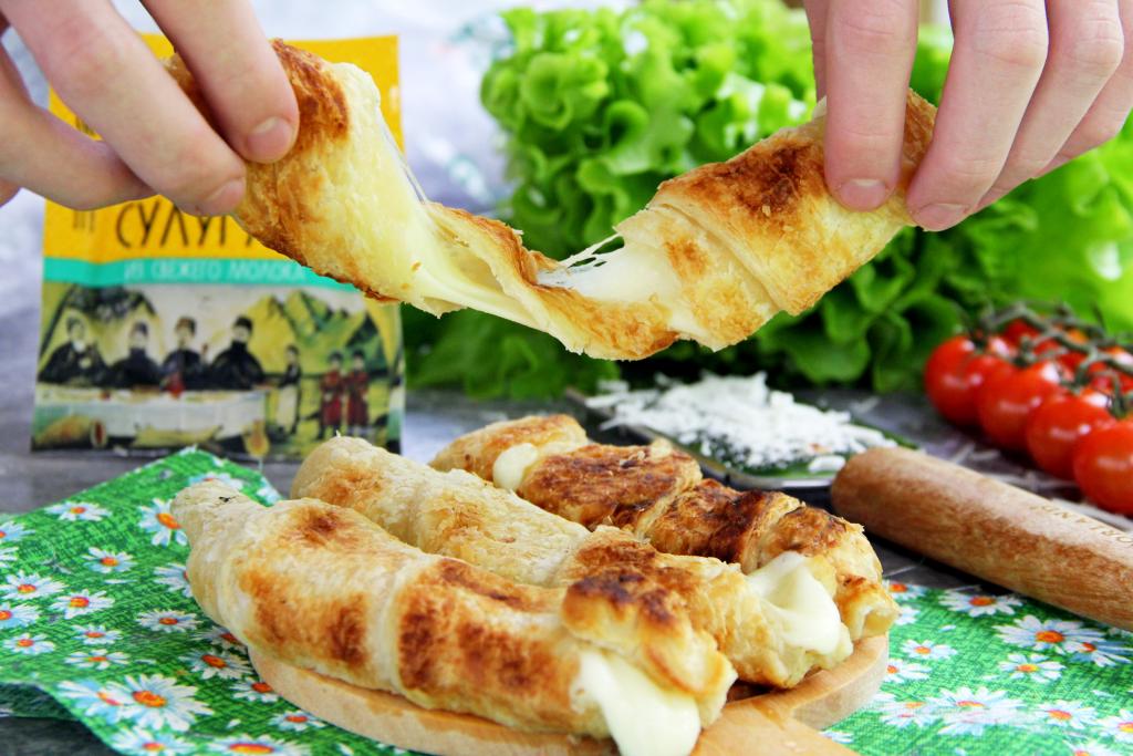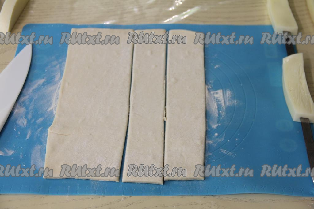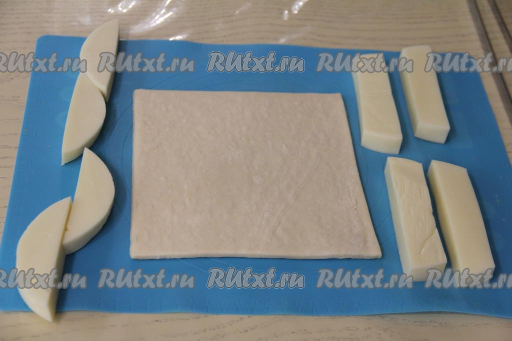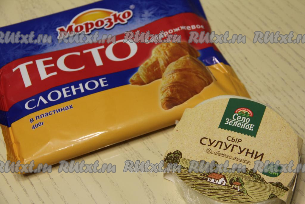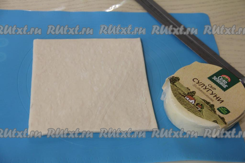 Подготовить продукты. Слоёное тесто можно взять как бездрожжевое (именно его я и использовала), так и дрожжевое. Слоёное тесто нужно полностью разморозить при комнатной температуре. Сыр можно взять как твёрдый, так и полутвёрдый (я взяла сулугуни).