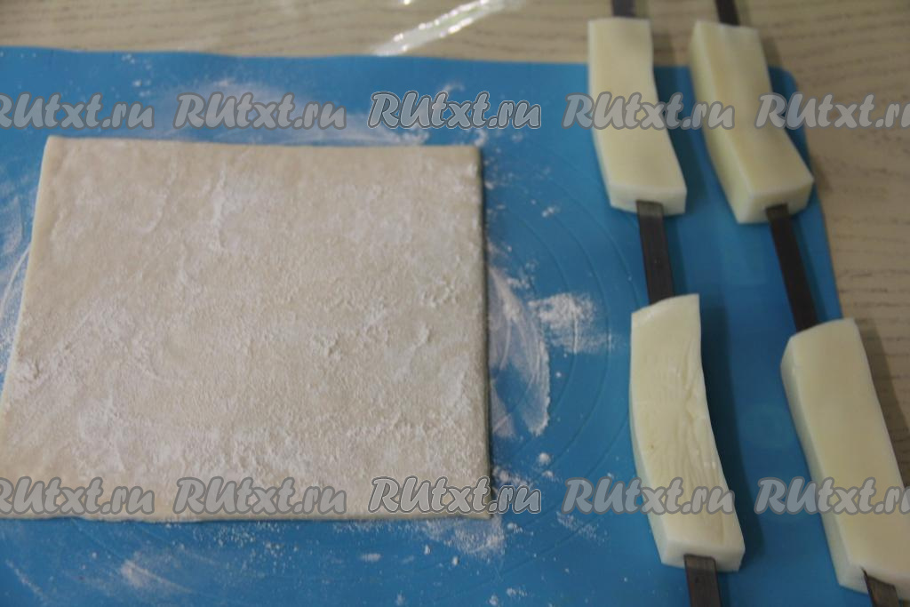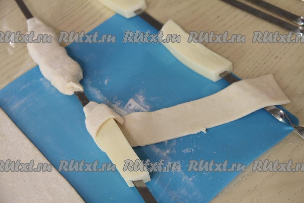Каждый брусок сыра обернуть в полоску из слоёного теста, накладывая тесто немного внахлёст и слегка растягивая его в процессе обматывания сыра. Слоёное тесто должно закрывать сыр с двух сторон. Тесто нужно хорошо прижать к шампурам с двух сторон, чтобы сыр был хорошо закрыт и не вытекал во время приготовления на мангале.