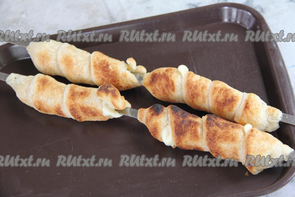 Жарить хачапури с сыром, часто переворачивая шампуры, минут 7 (слоёное тесто должно стать золотистого цвета, сыр внутри должен расплавиться).