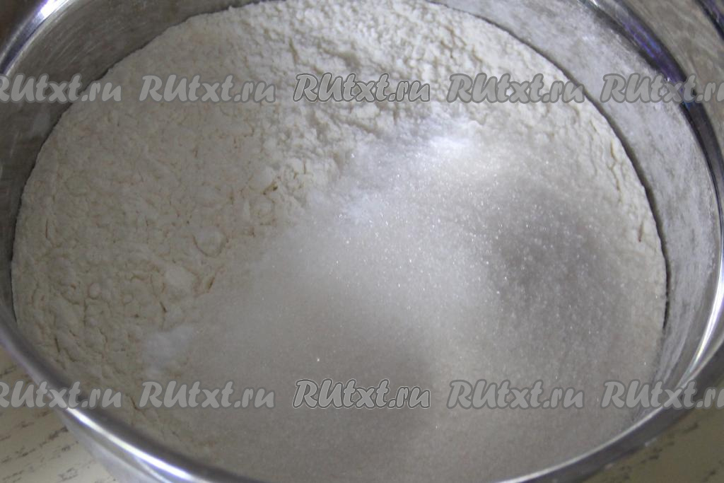 Сливочное масло растопить (я растапливаю в микроволновке), дать немного остыть. В миске соединить 200 грамм муки, сахар, соль и разрыхлитель, перемешать сухие ингредиенты.