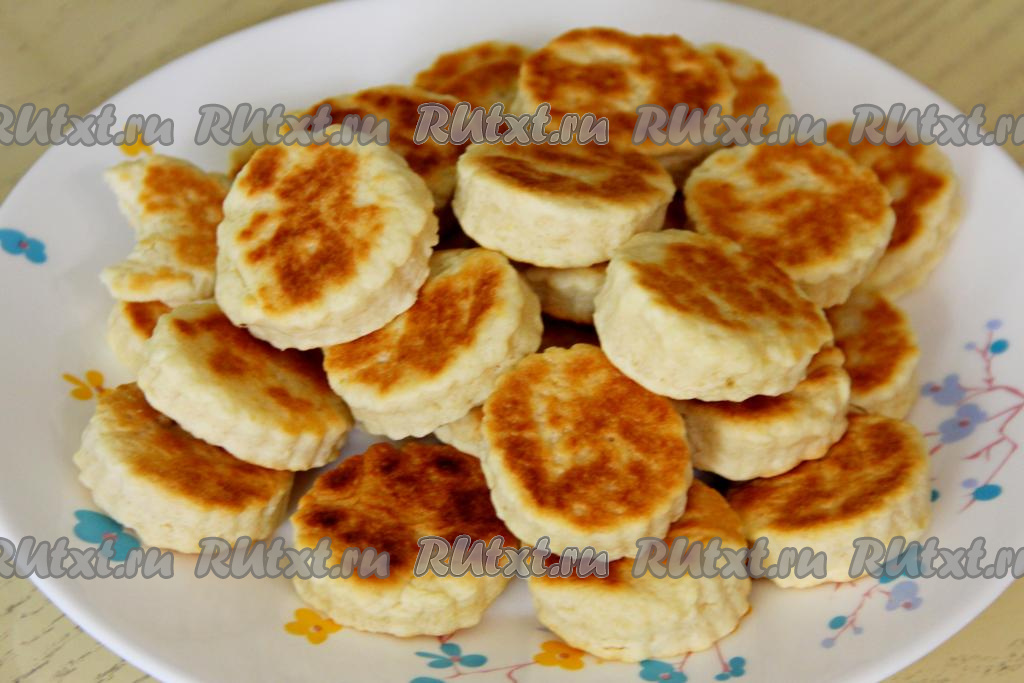Готовое печенье складывать на тарелку. Постепенно пожарить на сковороде всё печенье. Из предложенного количества ингредиентов получается большая тарелка печенюшек (больше 20 штук).