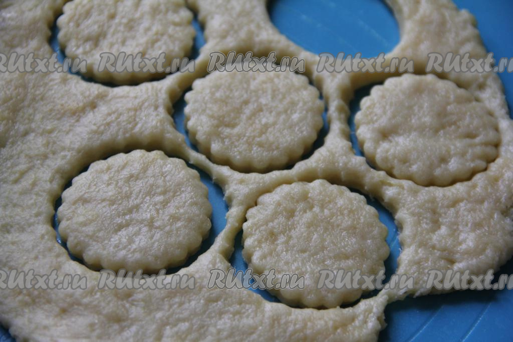 Это тесто очень приятное в работе. На слегка присыпанной мукой поверхности раскатать тесто в пласт толщиной 3-4 миллиметра, с помощью вырубки для печенья (или стаканом) вырезать кружочки любого диаметра (я использовала вырубку для печенья диаметром 4 сантиметра). Тесто, оставшееся после вырезки заготовок сметанного печенья, ещё раз раскатать и тоже вырезать заготовки печенья.