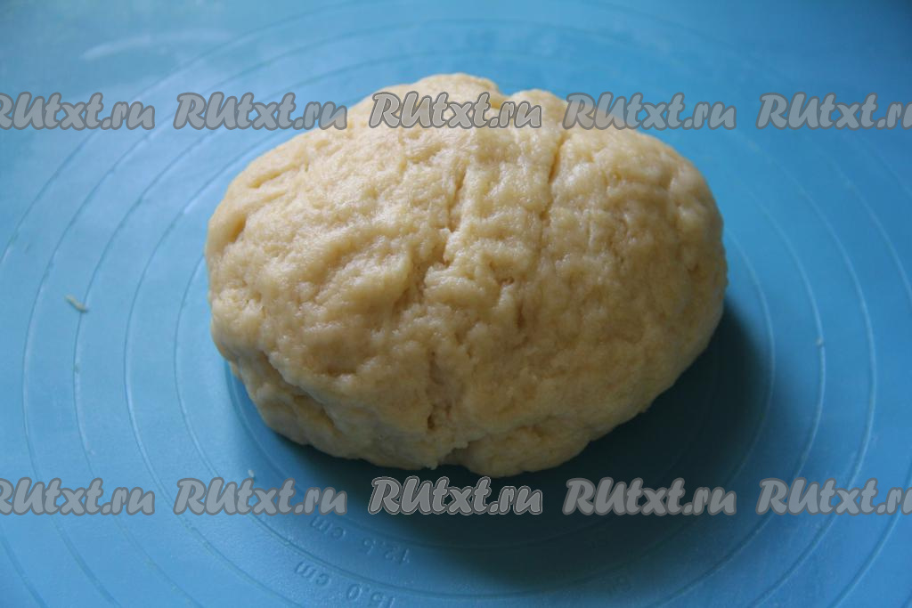 Перемешать тесто сначала ложкой. А затем, подсыпая частями оставшуюся муку, замесить руками мягкое, слегка липнущее тесто. Как только тесто стало едва липнущим, значит больше муку добавлять не нужно. Долго вымешивать это тесто не нужно, достаточно будет собрать его в шар.