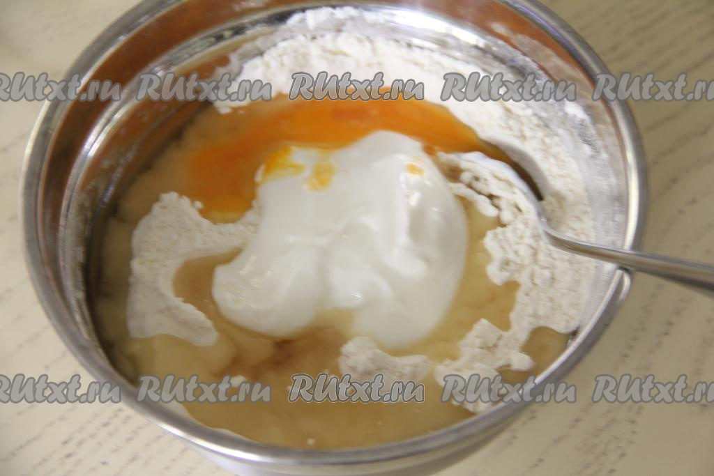В миску с сухими ингредиентами добавить сметану, сырое яйцо и растопленное остывшее сливочное масло.