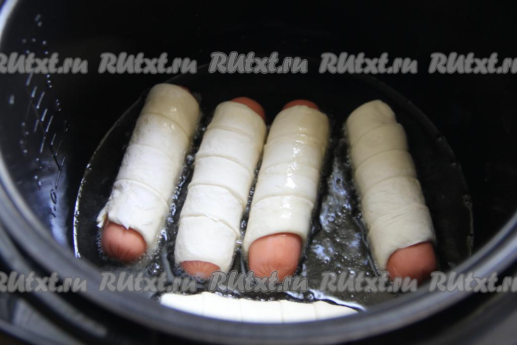 Не закрывая крышку мультиварки, жарить сосиски в тесте, периодически переворачивая, минут 10 (до золотистости слоёного теста со всех сторон).