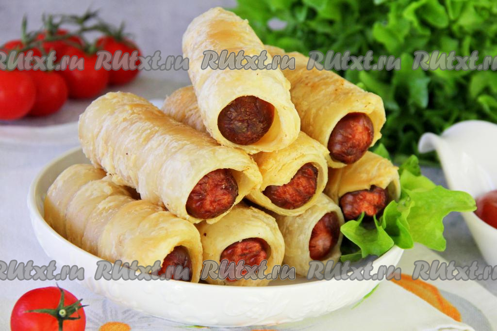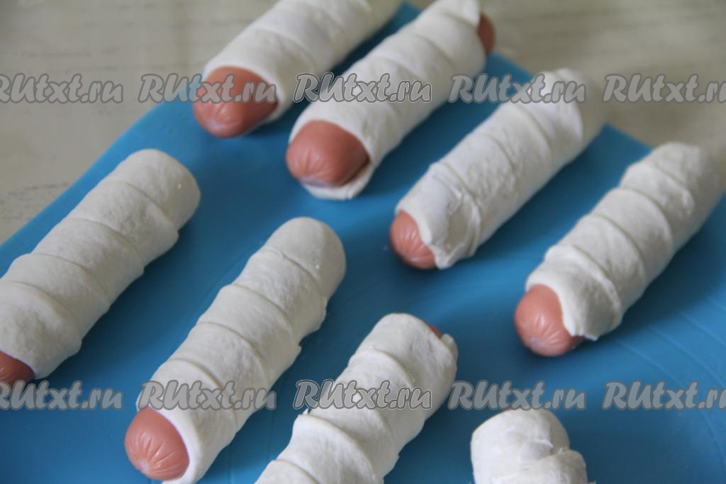 Каждую сосиску завернуть в полоску из слоёного теста, накладывая тесто внахлёст и слегка растягивая полоску из теста во время оборачивания. Конец полоски теста хорошо закрепить.