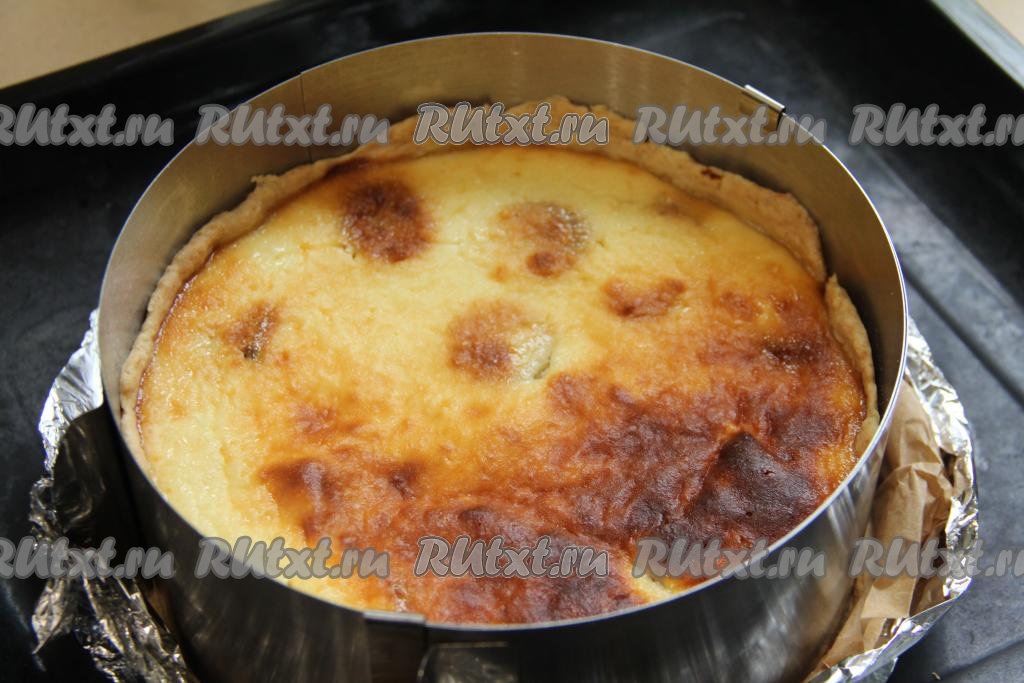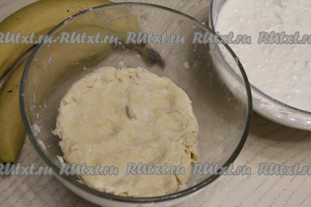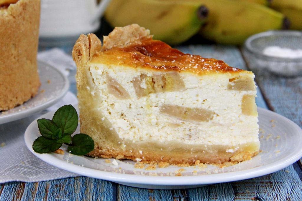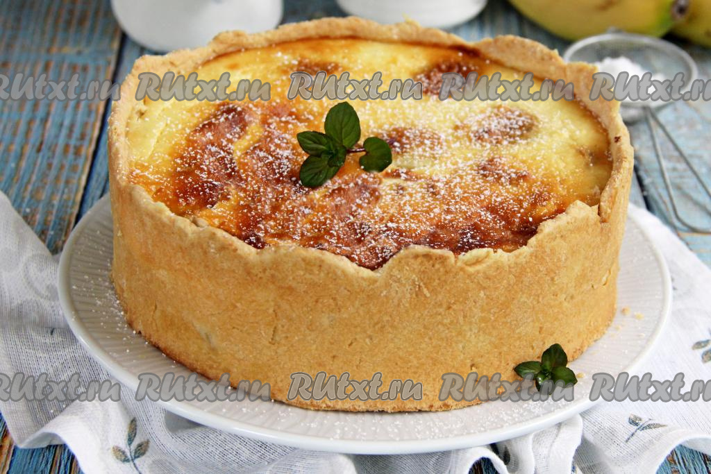 Получившуюся начинку из творога и бананов выложить в форму для выпечки поверх песочного теста. Поставить в духовку, разогретую до 180 градусов, выпекать пирог минут 50.