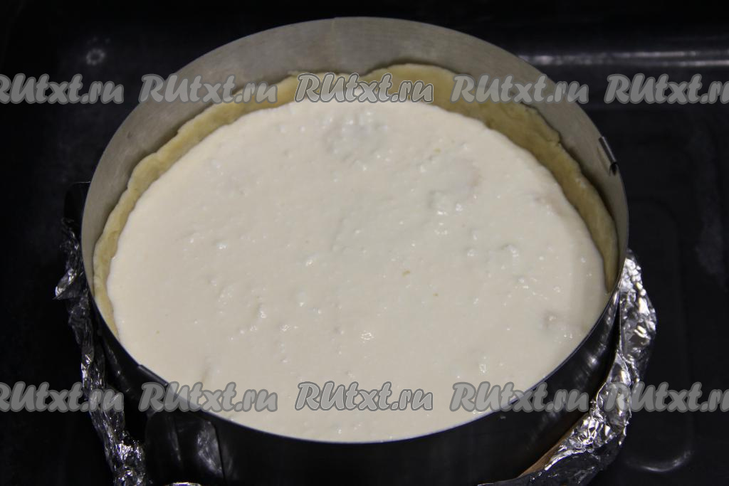 Выложить тесто в разъёмную форму для выпечки диаметром 20 сантиметров, сформировать ровное дно и достаточно высокие бортики.