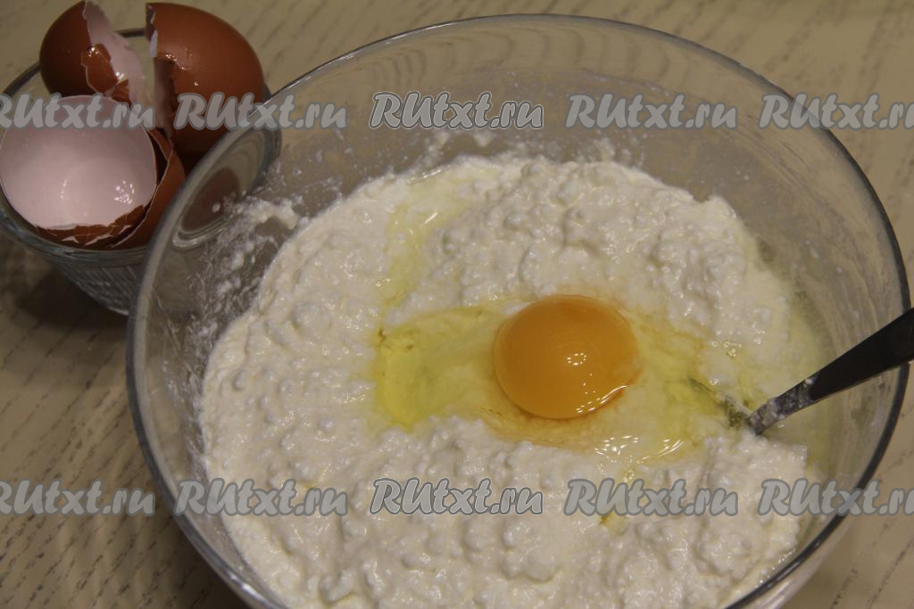 В получившуюся творожную массу начать по одному добавлять яйца, тщательно перемешивая после добавления каждого яйца.