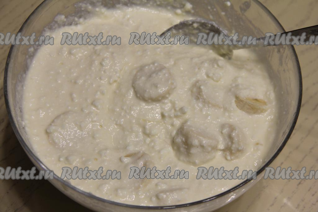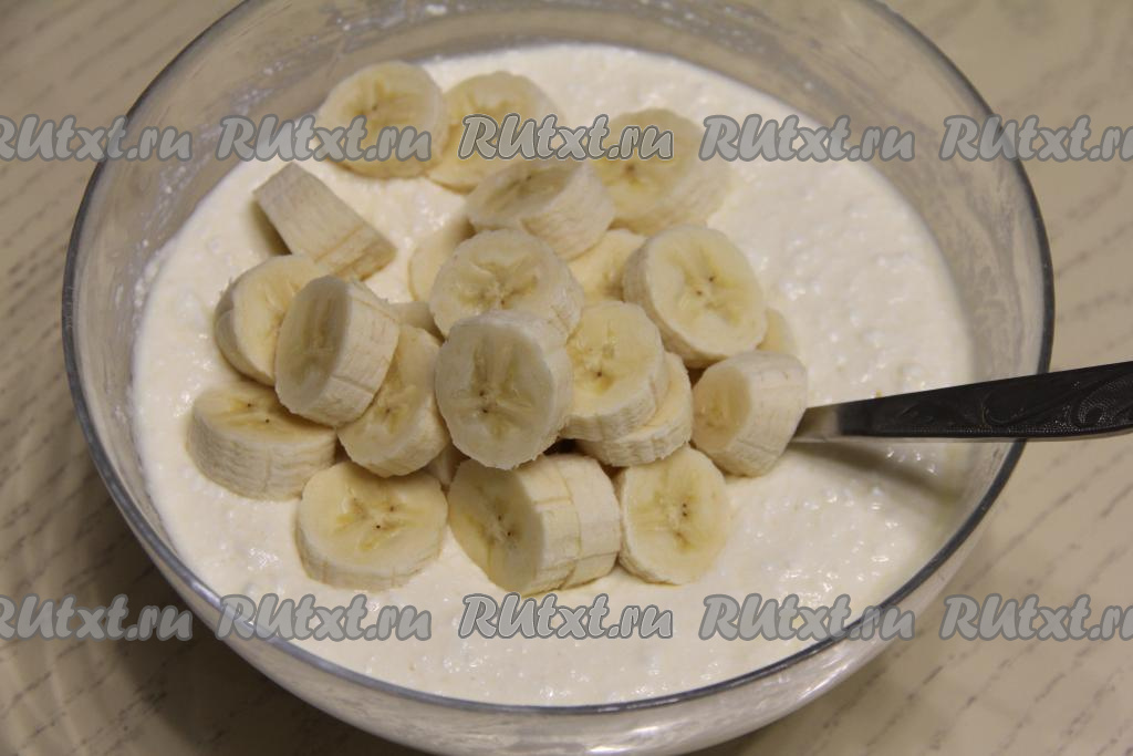 Творожная масса получится негустой. Бананы очистить, нарезать на кружочки толщиной примерно 1 сантиметр. Добавить нарезанные бананы в творожную массу.