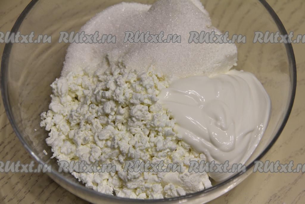 Для приготовления начинки нужно соединить в миске творог, сахар и сметану.