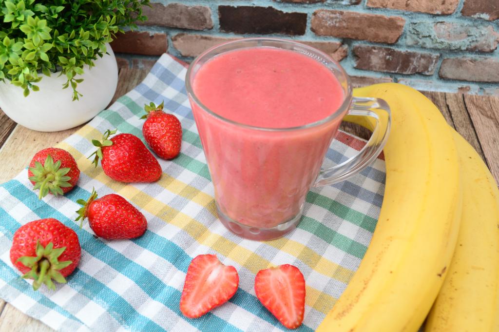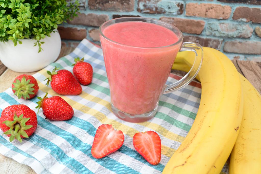 Самые простые продукты, всего несколько минут на кухне, а в результате вы получите вкуснейший, насыщенный и очень полезный смузи из клубники и банана. Его вполне можно подать в качестве перекуса в течение дня. Готовится он очень просто, с помощью погружного блендера, без добавления молока. В состав напитка входят всего 2 ингредиента: клубника и банан, даже сахар или мёд я не добавляю (впрочем, сладость можете регулировать, исходя из того, насколько сладкие ягоды и фрукты вы используете). Уверена, смузи, приготовленный по этому простейшему рецепту, понравится и взрослым, и деткам!