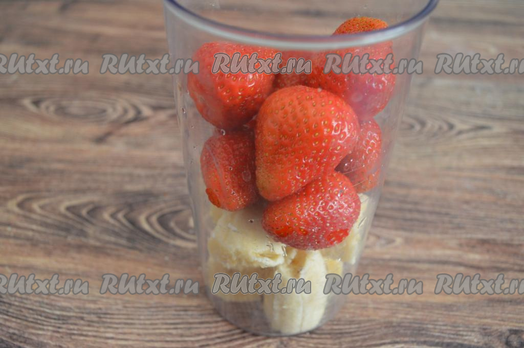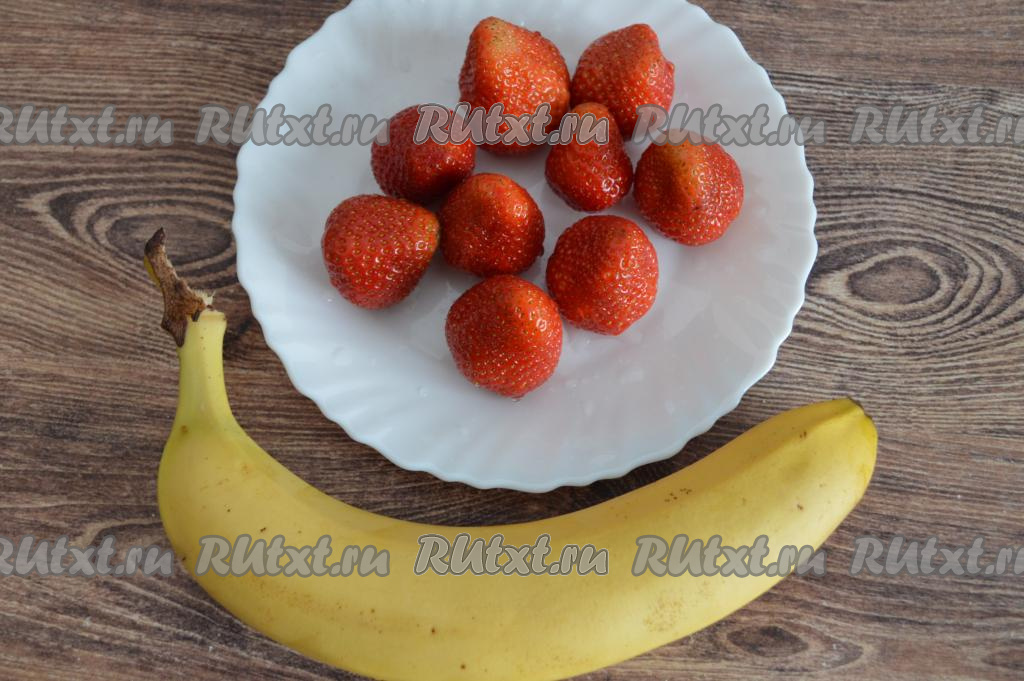 Банан и клубнику лучше выбирать сладкие, тогда в смузи не придётся добавлять сахар или мёд. Клубнику отделить от чашелистиков (в результате у меня получились 200 грамм ягод), промыть водой, немного обсушить.