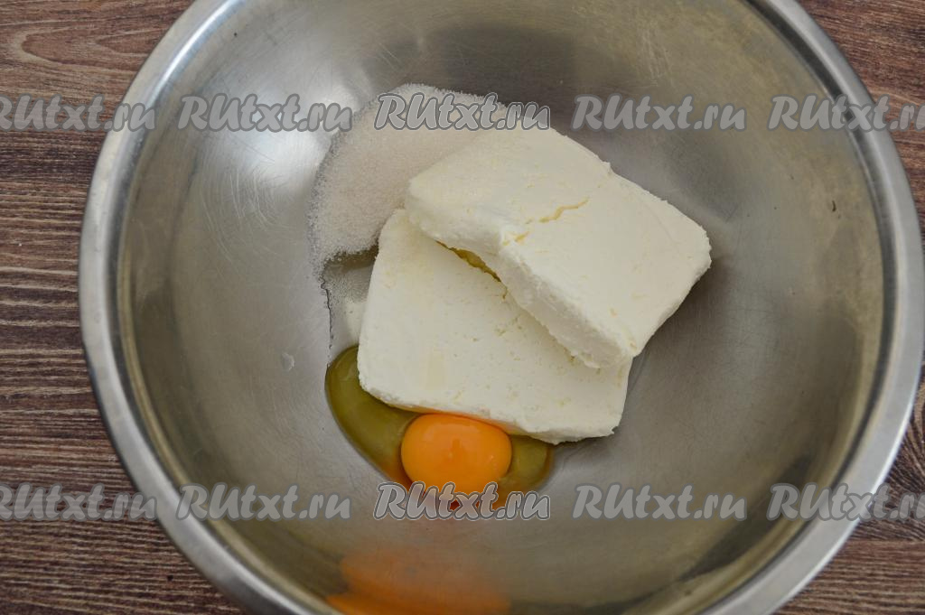 В миску всыпать сахар, выложить творог, вбить сырое яйцо.