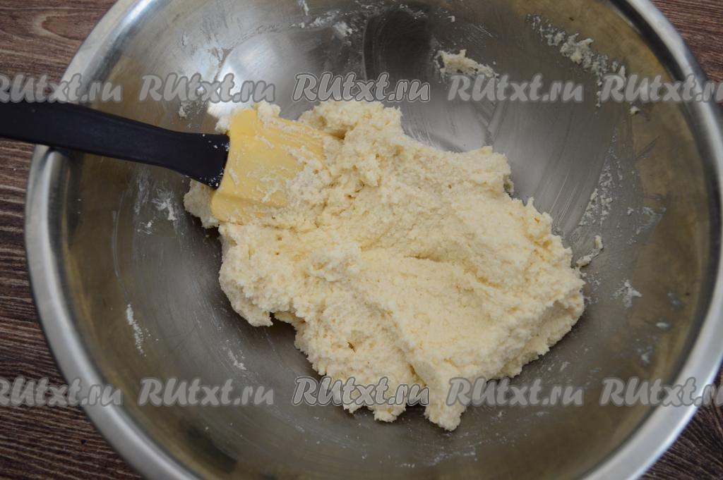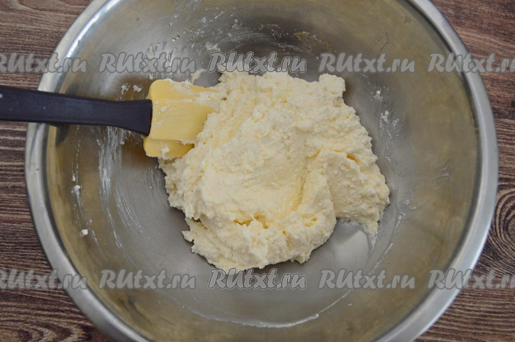 Сначала при помощи вилки растереть творог с сахаром и яйцом, а затем перемешать творожную массу до однородности лопаткой (или столовой ложкой).