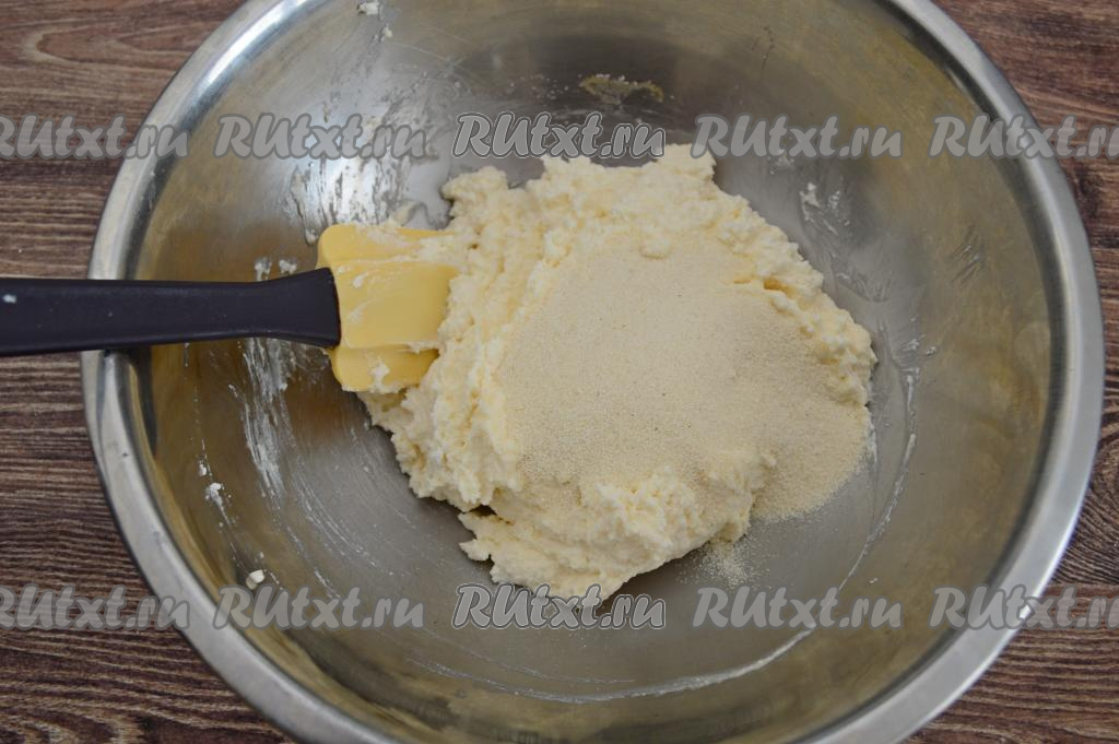 Лопаткой (или ложкой) тщательно вмешать манную крупу. Тесто по консистенции будет липким, комковатым, но при этом оно будет держать форму, если его слегка сжать в ладони. Оставить тесто на 10 минут, чтобы манка набухла.