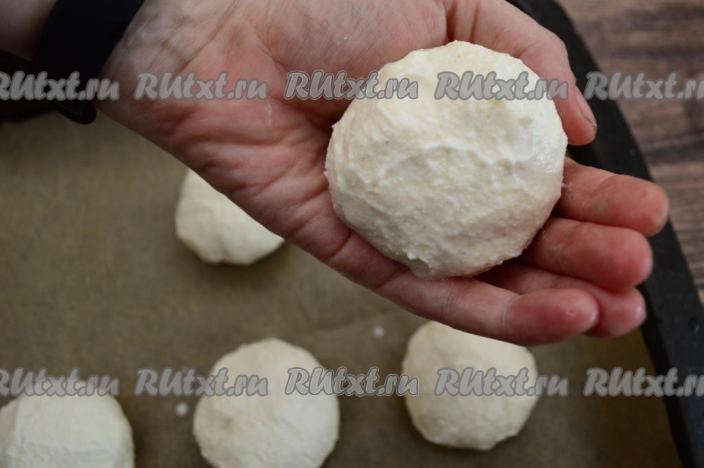 По прошествии 10 минут зрительно разделить творожно-манное тесто на равные части (я разделил на 6 частей). Из каждой части теста влажными руками сформировать округлый сырник, выложить на противень, застеленный бумагой для выпечки.