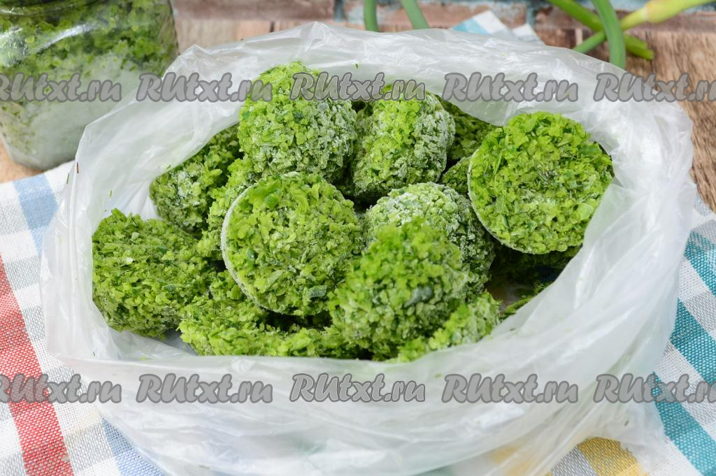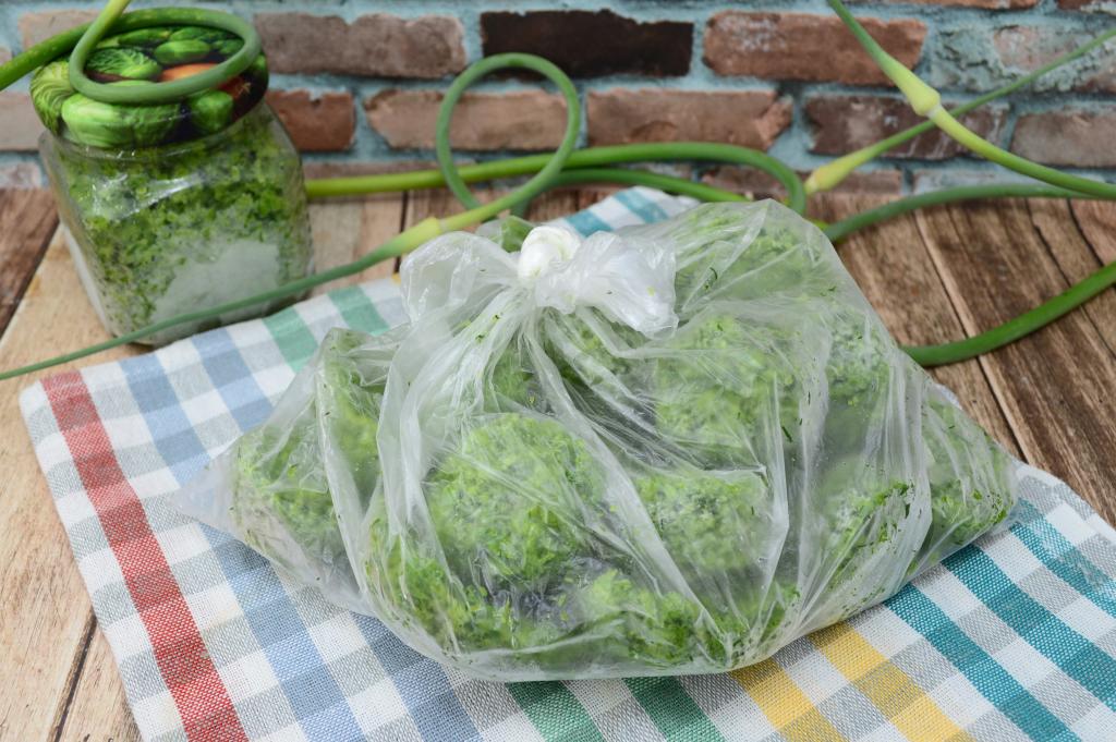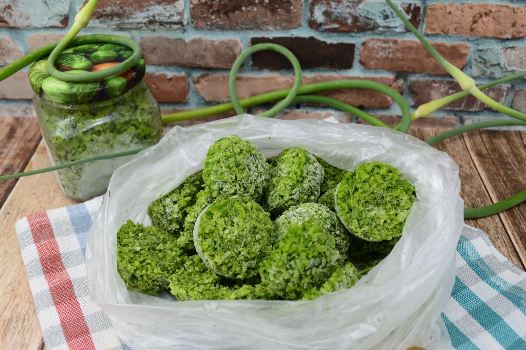 Через 24 часа достать силиконовые формы из морозилки, извлечь из них замороженные чесночные стрелки с укропом и сложить в целлофановый пакет.
