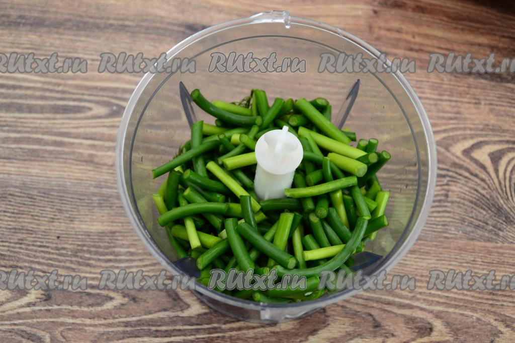 Если нет измельчителя, можно пропустить чесночные стрелки с укропом через мясорубку.