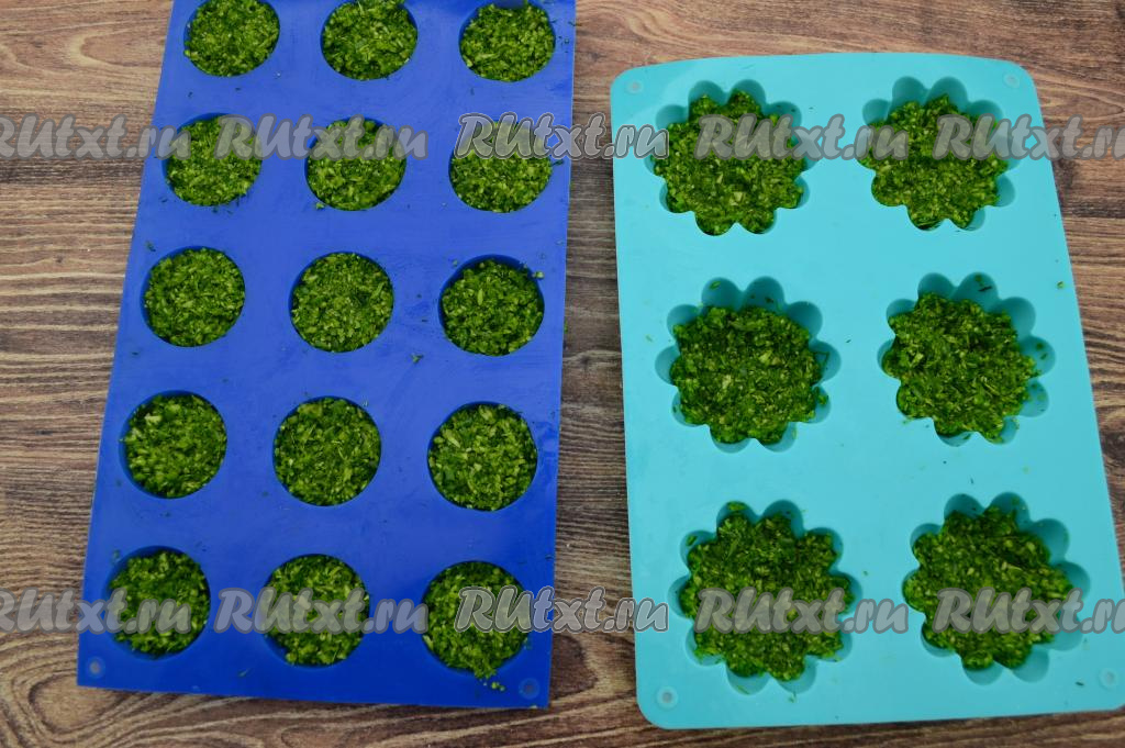 Затем разложить чесночные стрелки с укропом по силиконовым формочкам. Я советую раскладывать по маленьким силиконовым формочкам (например, по формочкам для приготовления конфет), тогда будет удобно зимой взять 1-2 порционных кубика и добавить их в первые или вторые блюда. Можно раскладывать и по формочкам для кексов, но в этом случае я заполняю формочки до половины.