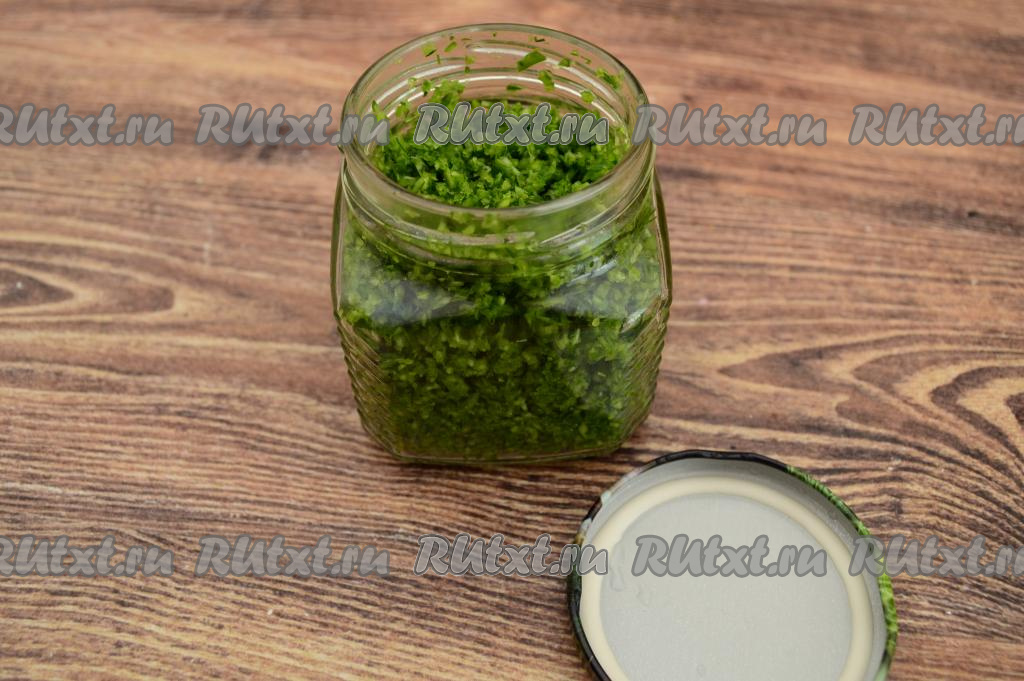 Можно просто разложить чесночные стрелки с укропом по чистым стеклянным банкам с крышками (я остатки смеси из чесночных стрелок, укропа и масла выложила в баночку объёмом 250 миллилитров). Я всегда перед выкладыванием стрелок чисто вымытые банки и крышки обдаю кипятком, даю обсохнуть. Зимой я достаю такую баночку из морозилки, открываю, достаю нужное количество заготовки, после этого закрываю банку крышкой и снова отправляю в морозилку.