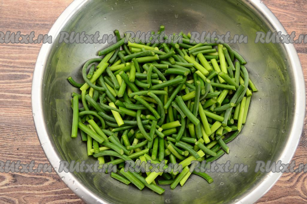 Подготовить продукты. Чесночные стрелки лучше собирать молодые, они более нежные и сочные.