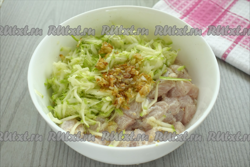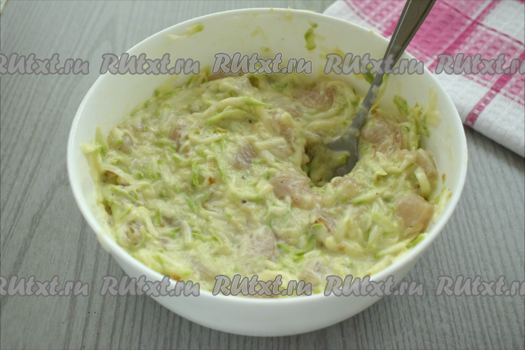 После того как кабачок просолится в течение 10 минут, он выделит достаточно много сока. Тщательно отжимаем кабачковую массу руками от лишнего сока (выделившийся сок нам не понадобится). К куриному филе, промариновавшемуся в сметане, добавляем остывший жареный лук и отжатую от сока кабачковую массу.