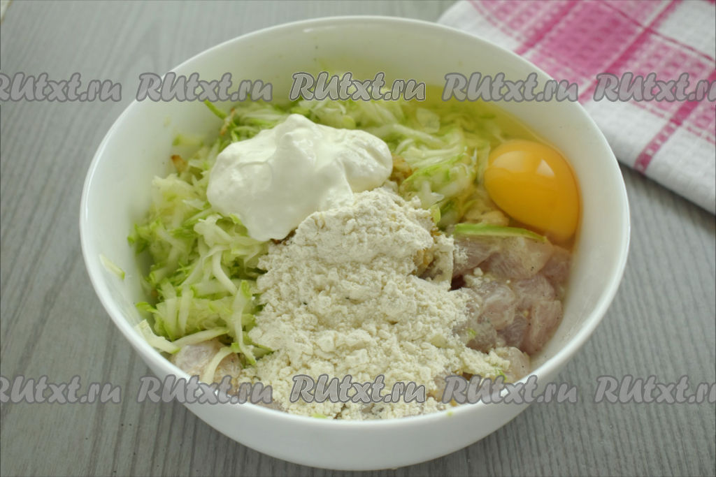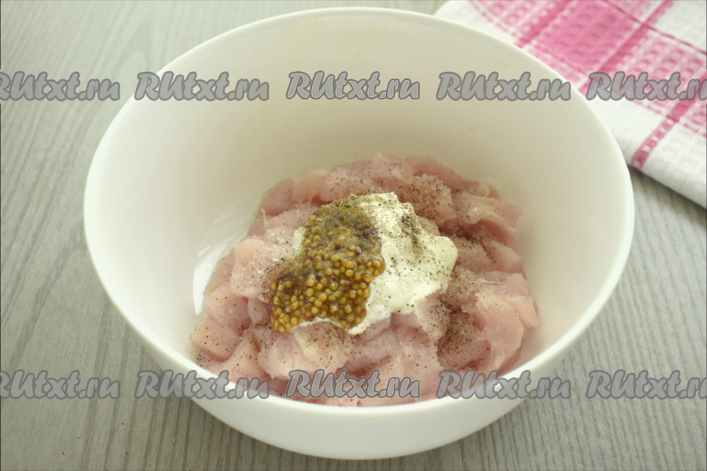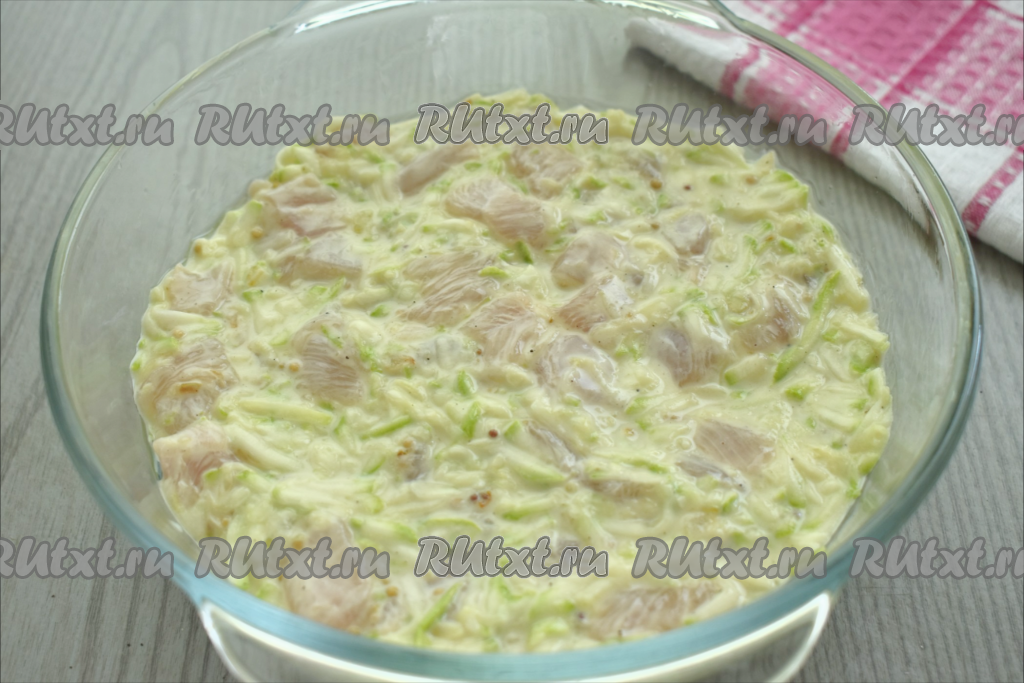 Куриное филе моем, обсушиваем, нарезаем на небольшие кубики, перекладываем в объёмную миску. К мясу выкладываем 1 столовую ложку сметаны, всыпаем соль (добавляя соль, обязательно нужно учитывать, что в дальнейшем будет добавляться подсоленный кабачок), чёрный молотый перец, по желанию, можно добавить французскую горчицу.