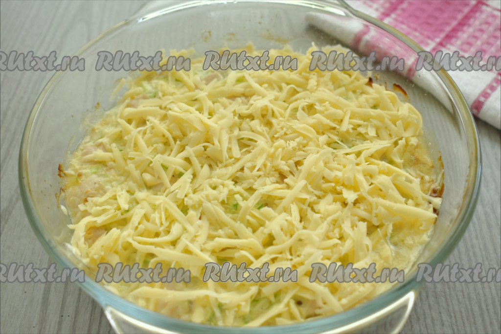 Затем достаём запеканку из кабачков с курицей из духовки, посыпаем её сыром, натёртым на крупной тёрке.