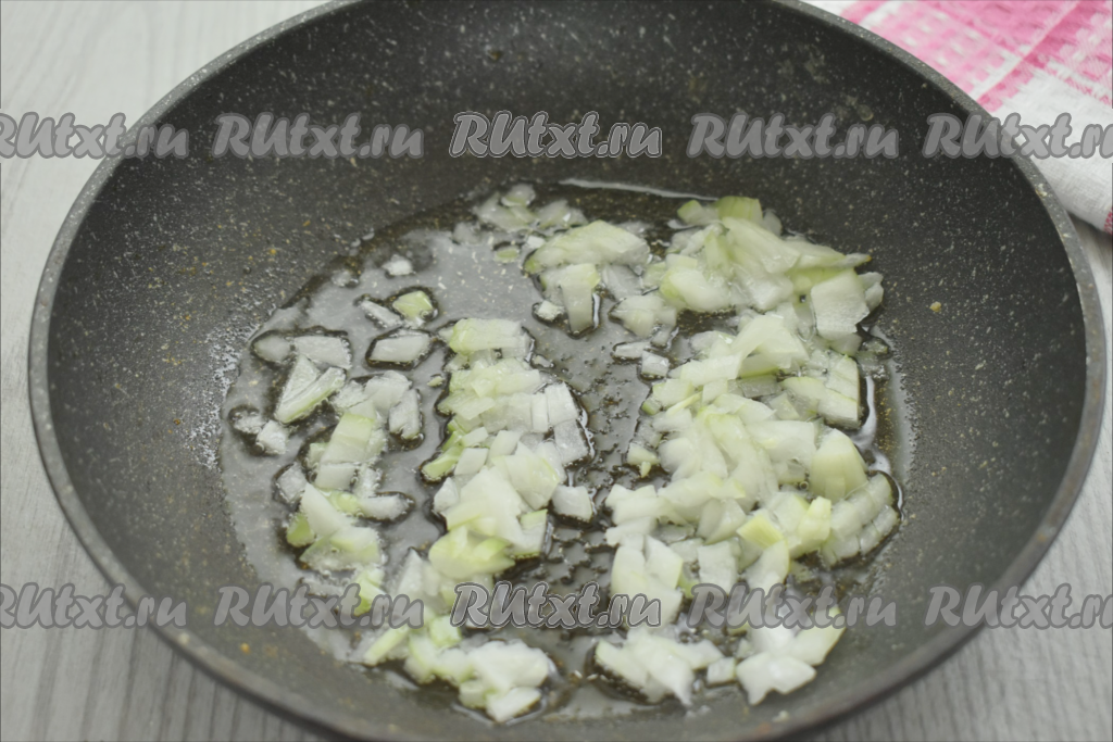 Разогреваем в сковороде растительное масло, выкладываем очищенный и достаточно мелко нарезанный лук, обжариваем его до золотистости (в течение 4-5 минут) на среднем огне, иногда перемешивая. Убираем с огня, даём остыть.