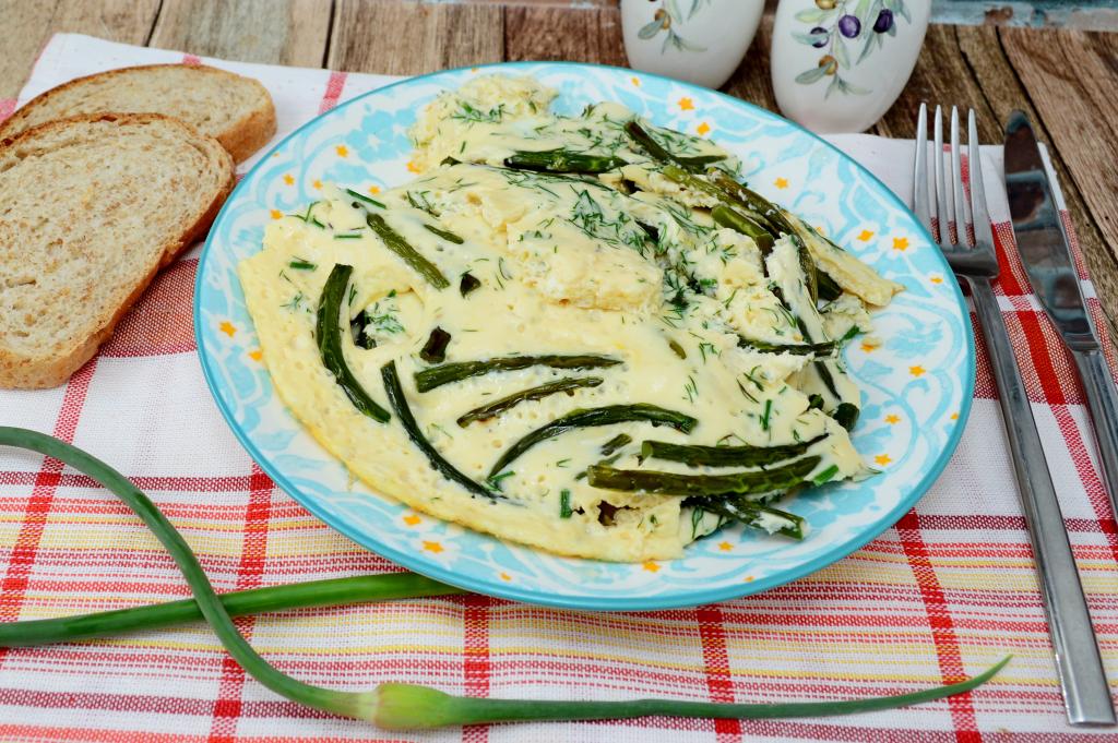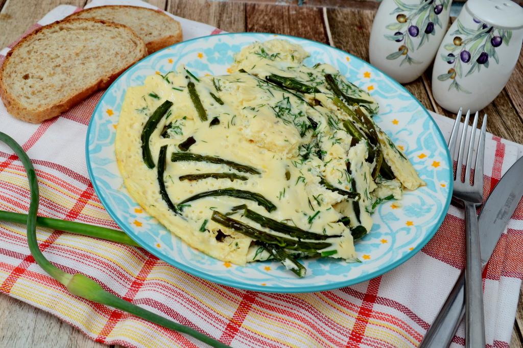 Готовый омлет со стрелками чеснока убрать с огня и можно сразу же подавать к столу. Вкусный, яркий, полезный омлет станет отличным началом дня!