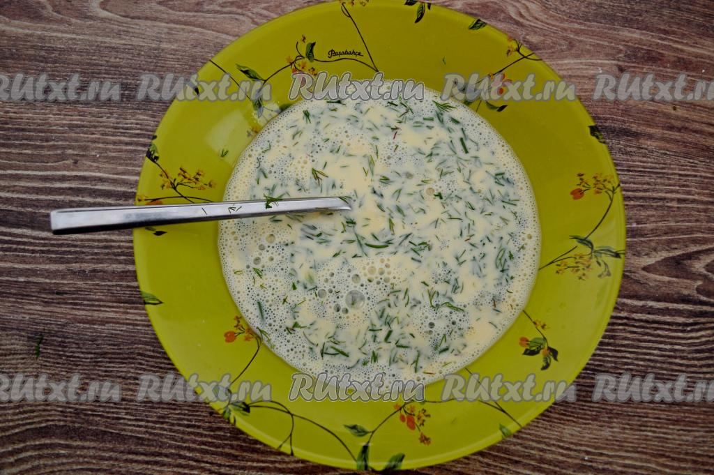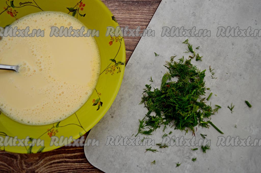 В яично молочную смесь добавить укроп, перемешать.