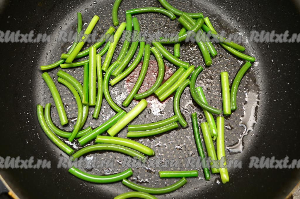 На сковороду влить 2 столовых ложки растительного масла, немного прогреть, выложить стрелки чеснока. Жарить чесночные стрелки в течение 5 минут на среднем огне, при этом каждую минуту их следует перемешивать.