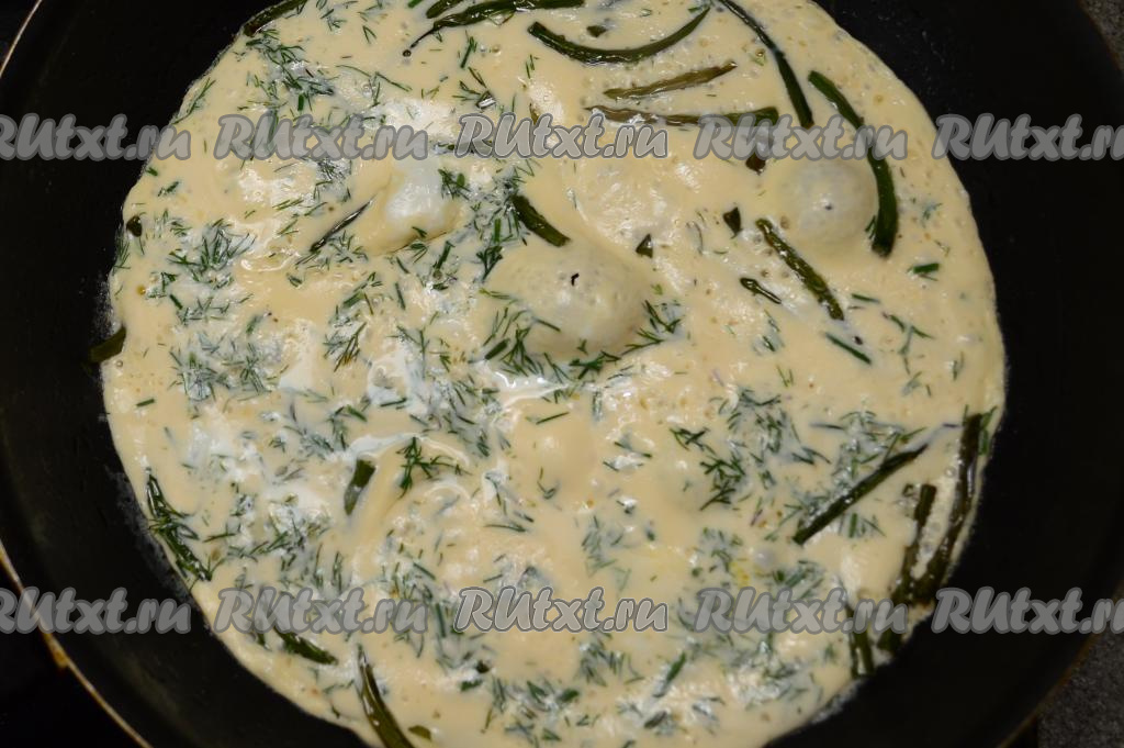 Омлет с чесночными стрелками готовить в течение 3-4 минут. Яичная масса должна полностью схватиться и не иметь влажных участков.