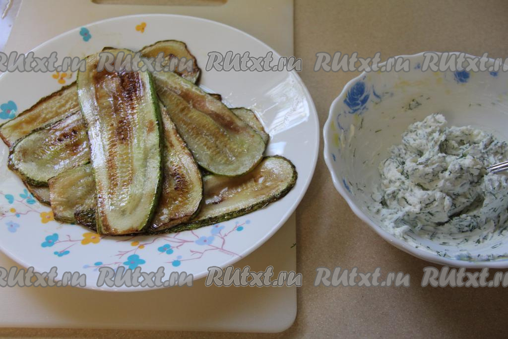 После того как полоски из кабачка и начинка будут готовы, можно приступать к формированию рулетиков.