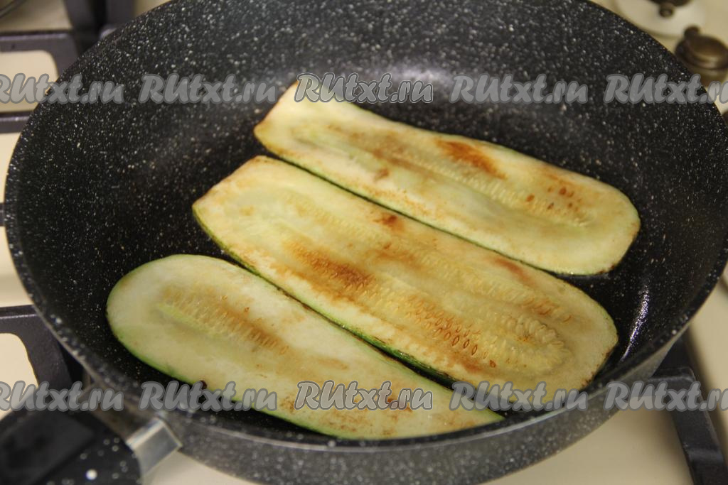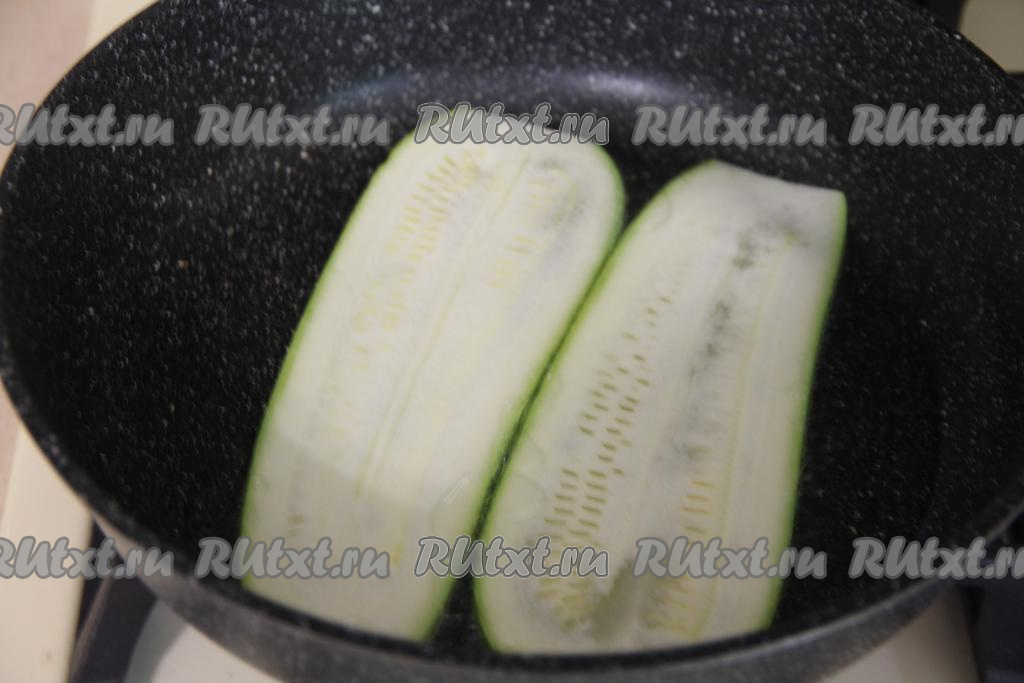 Сковороду разогреть, влить масло, выложить несколько полосок из кабачка в один слой.