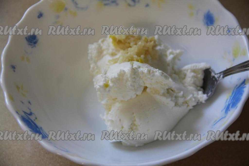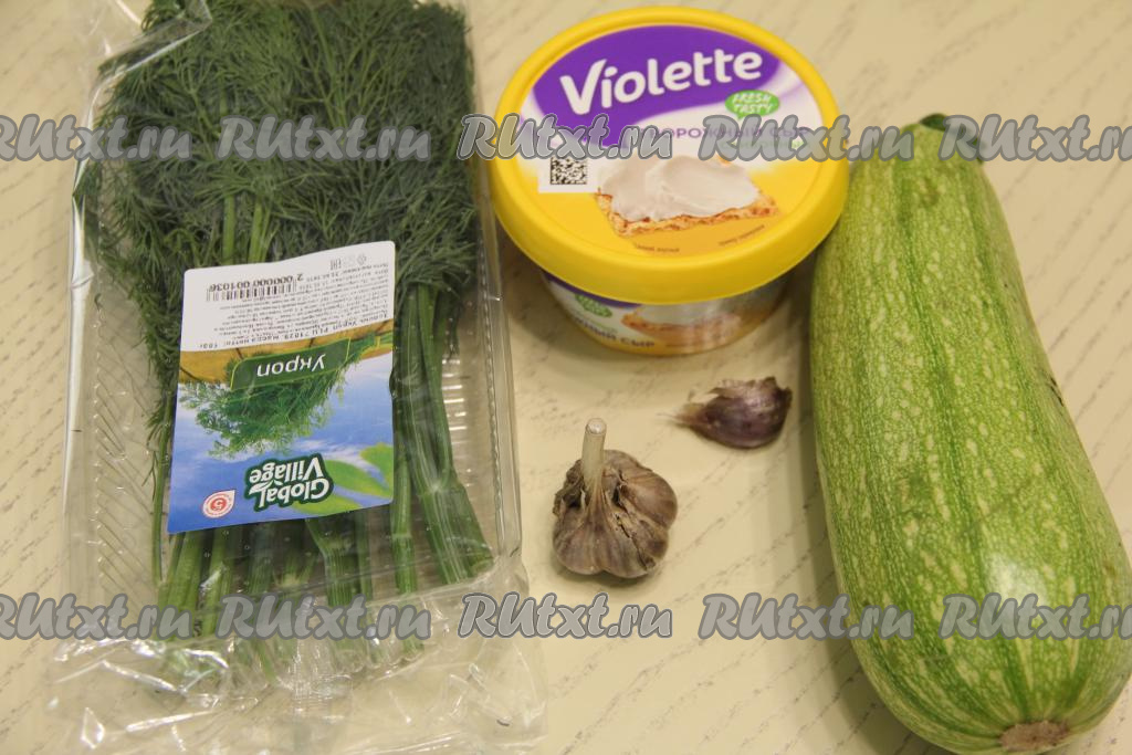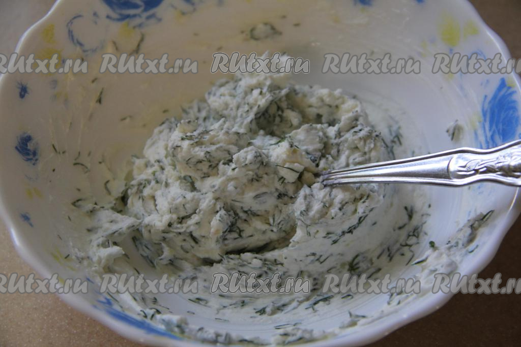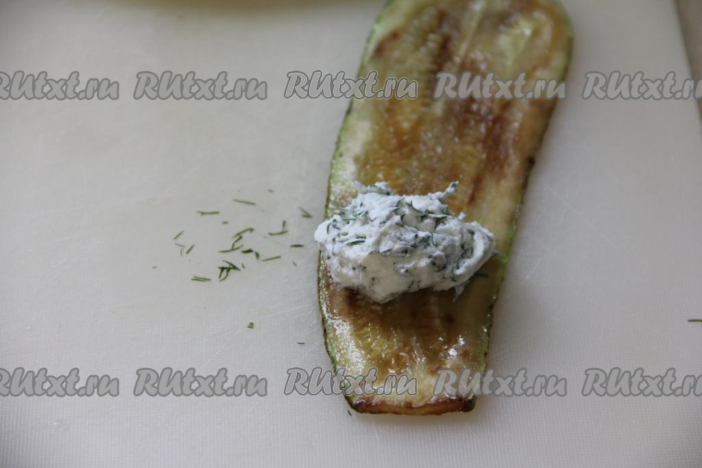Творожный сыр тщательно перемешать с чесноком и укропом, после этого начинка для рулетиков из кабачков будет готова.