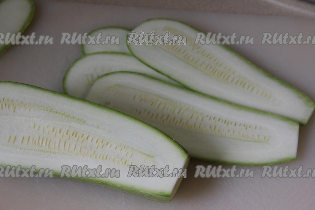 Нарезать кабачок на тонкие полоски толщиной ориентировочно 3-4 миллиметра (у меня получились 8 полосок).